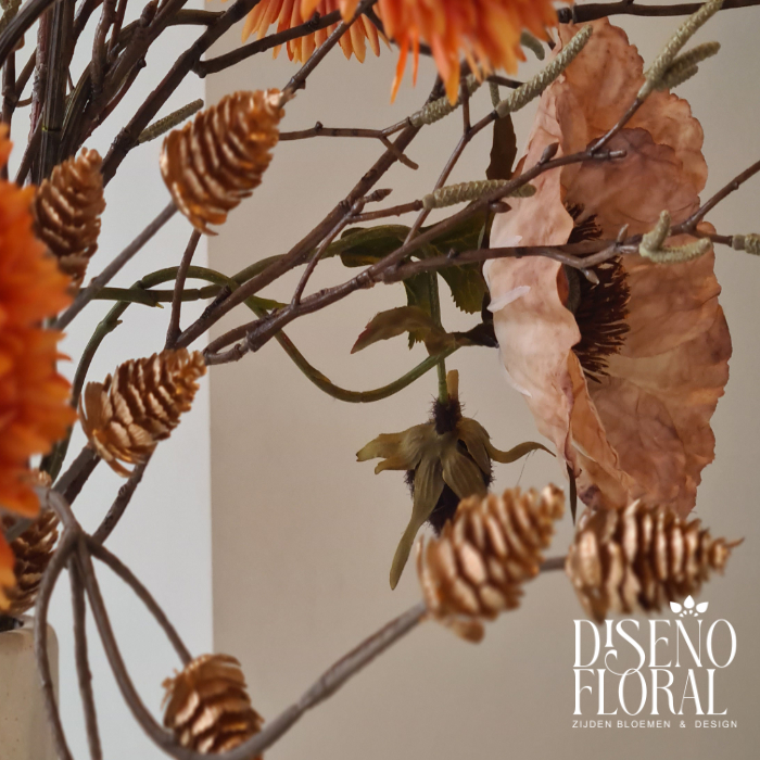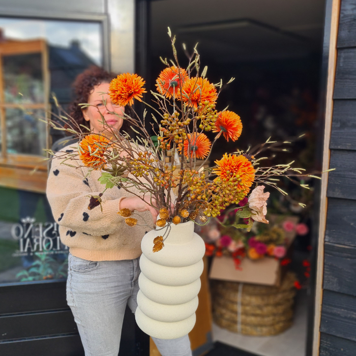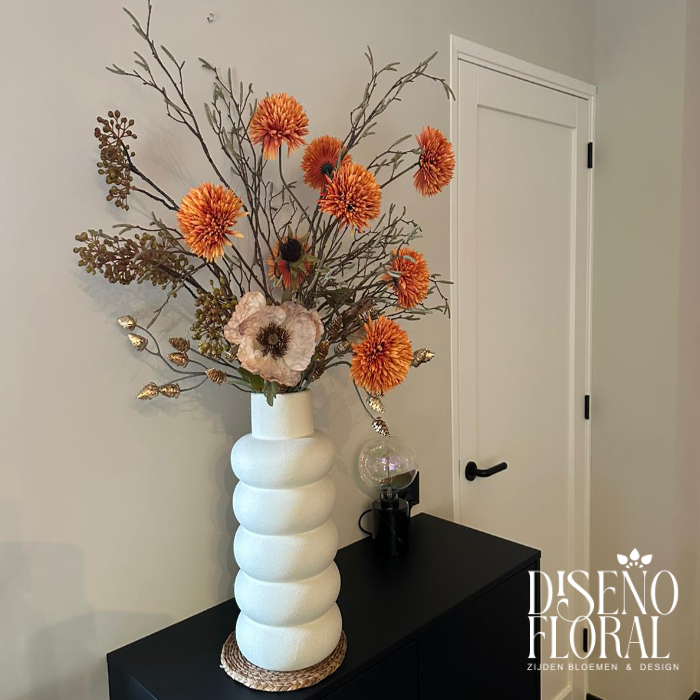 Het boeket past perfect in een modern interieur door de combinatie van aardetinten, structuur en de minimalistische vaas. De oranje bloemen brengen warmte, terwijl de gedroogde elementen het geheel tijdloos maken