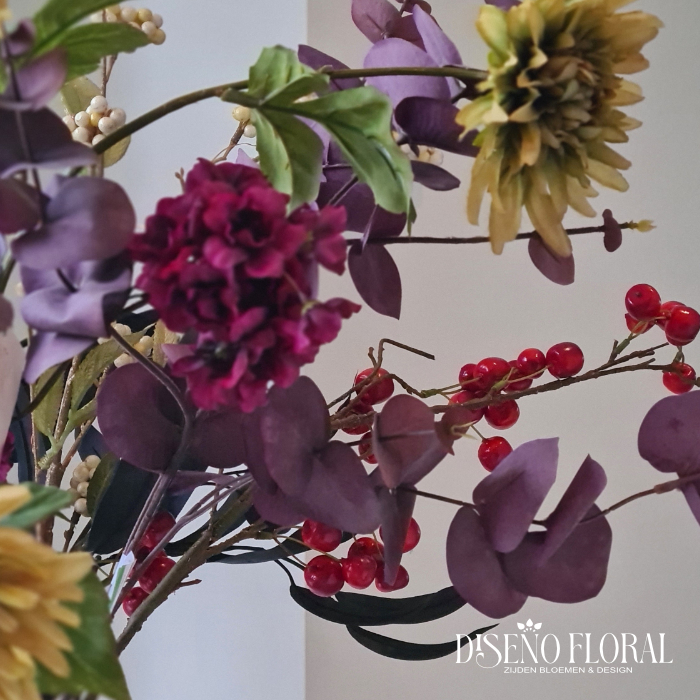 Dit elegante boeket met warme goudtinten, diepe bordeaux accenten en zachte witte details, verrijkt met paars eucalyptusblad voor een moderne en luxe uitstraling.
